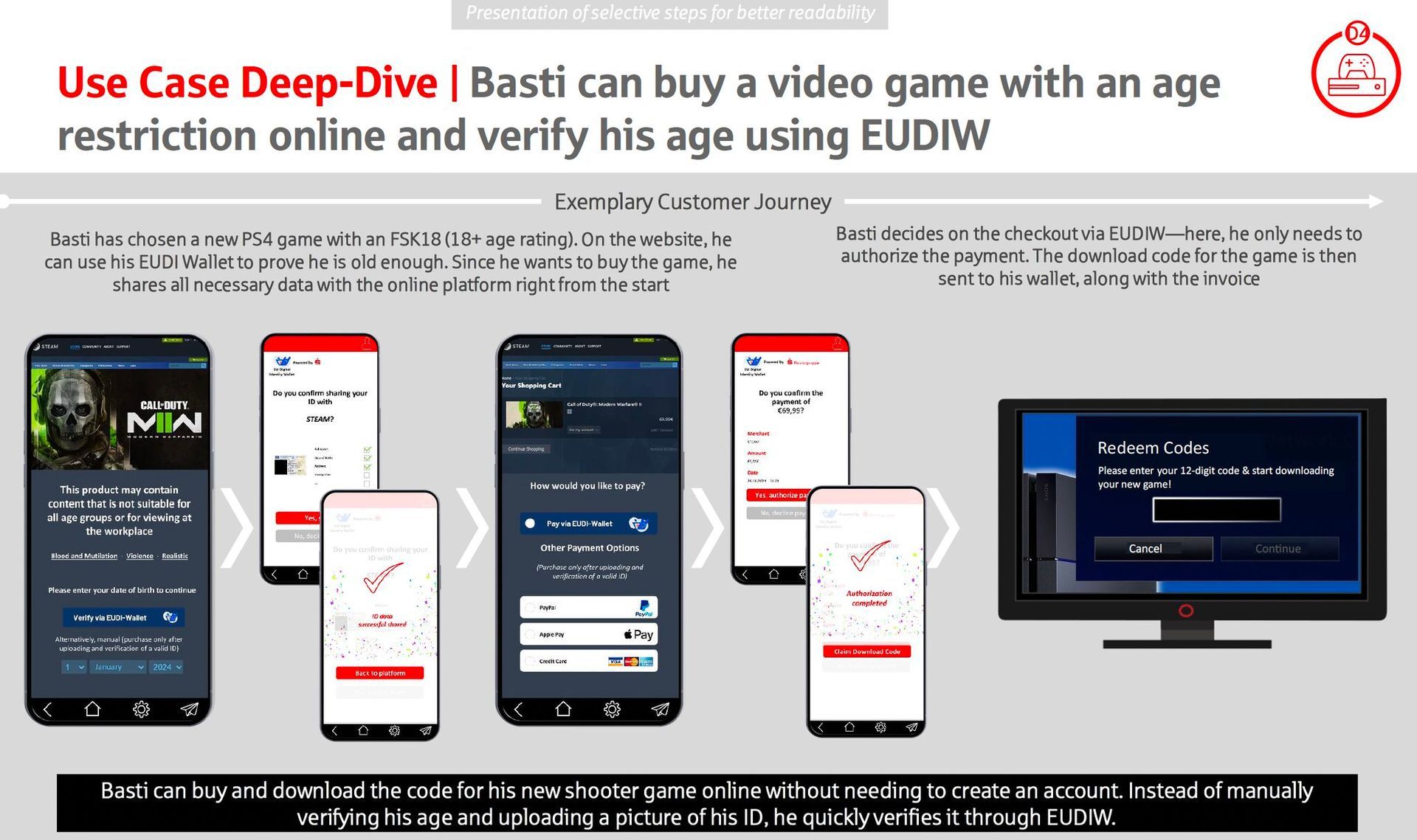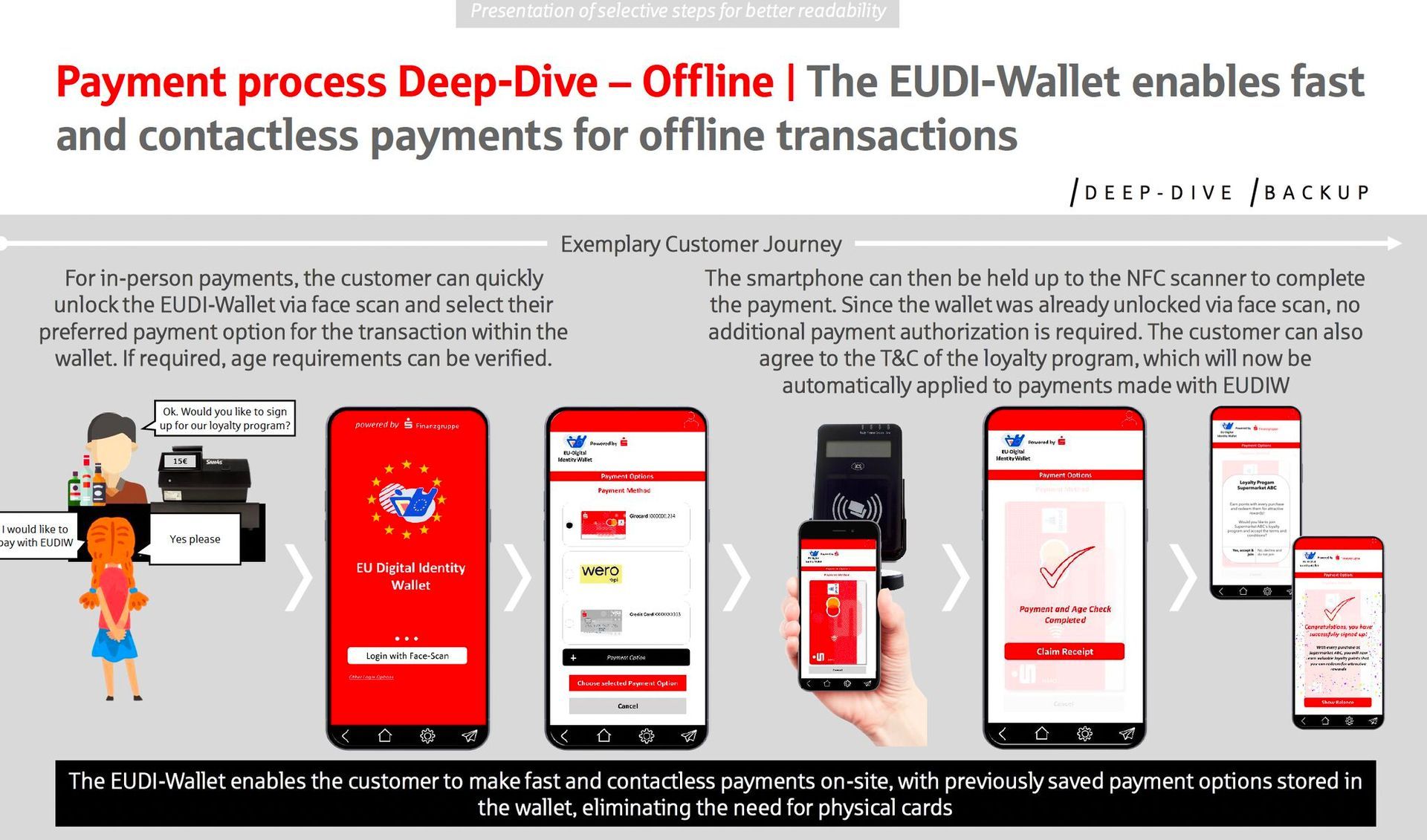 Die folgenden Bilder konzentrieren sich auf einen zentralen Aspekt der EUDIW, der auch in den Episoden 1-6 verwendet wurde. Die synergetische Fähigkeit der angedachten offenen #EUDIW-Architektur. Zusammen mit dem Auslösen einer Zahlung könnte z.B. auch eine Adresse oder ein Altersscheck übermittelt werden und so ein bequemes und einfaches schnelles Auschecken ermöglichen.